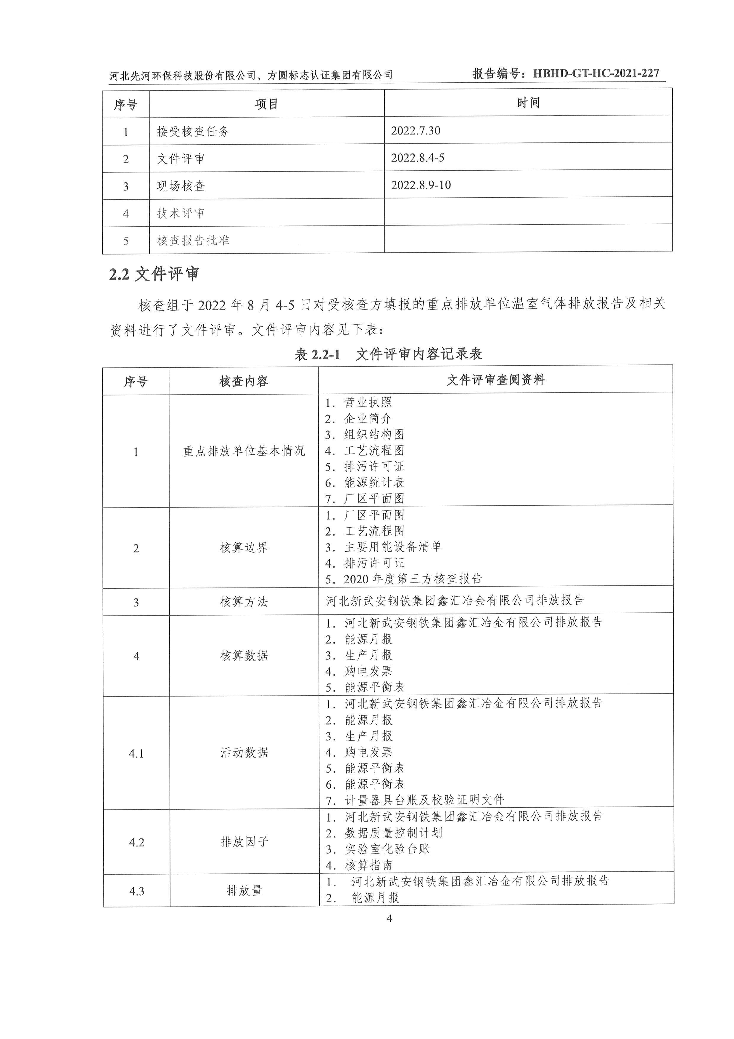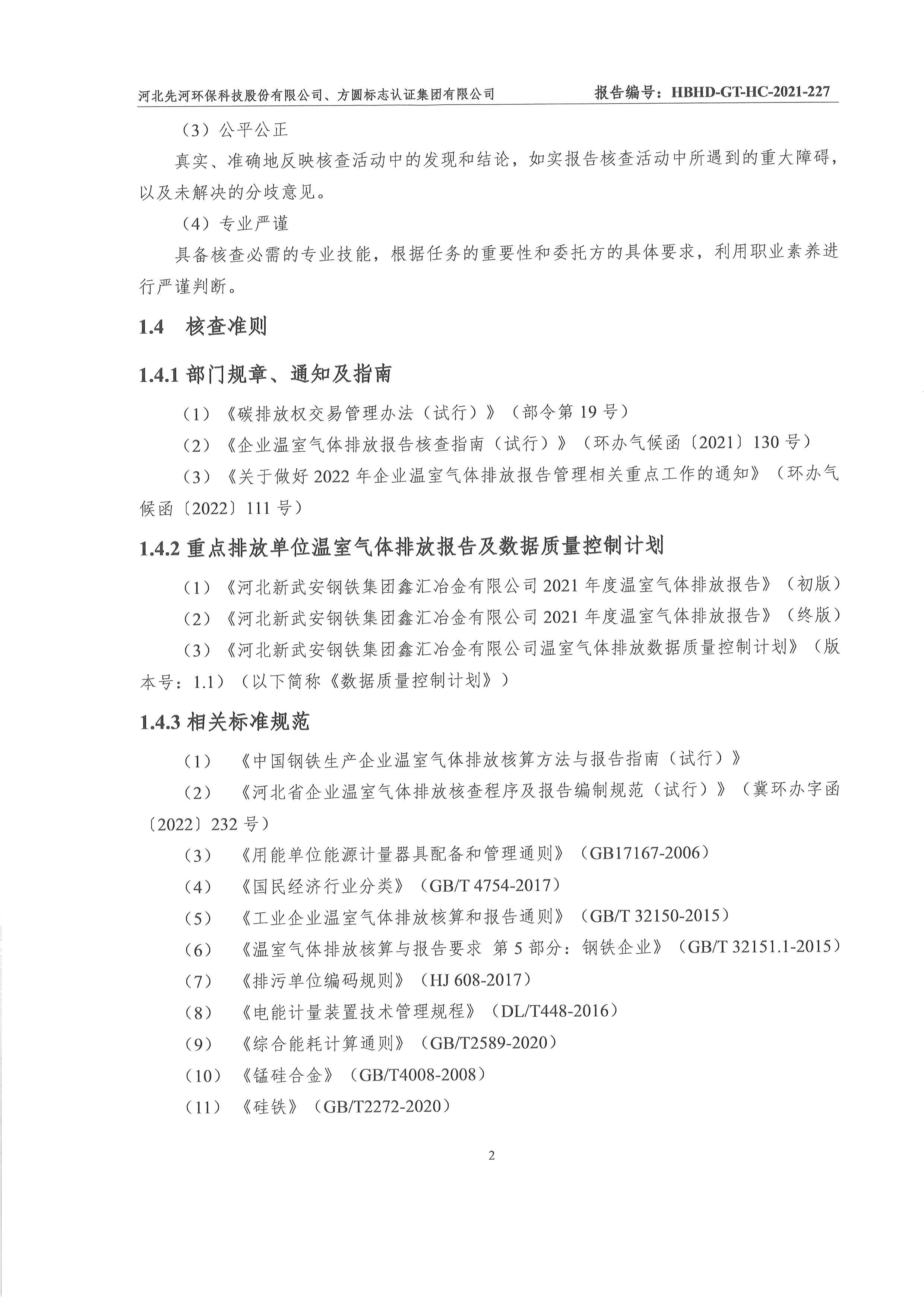 2021年河北新武安鋼鐵集團鑫匯冶金有限公司碳排放核查報告