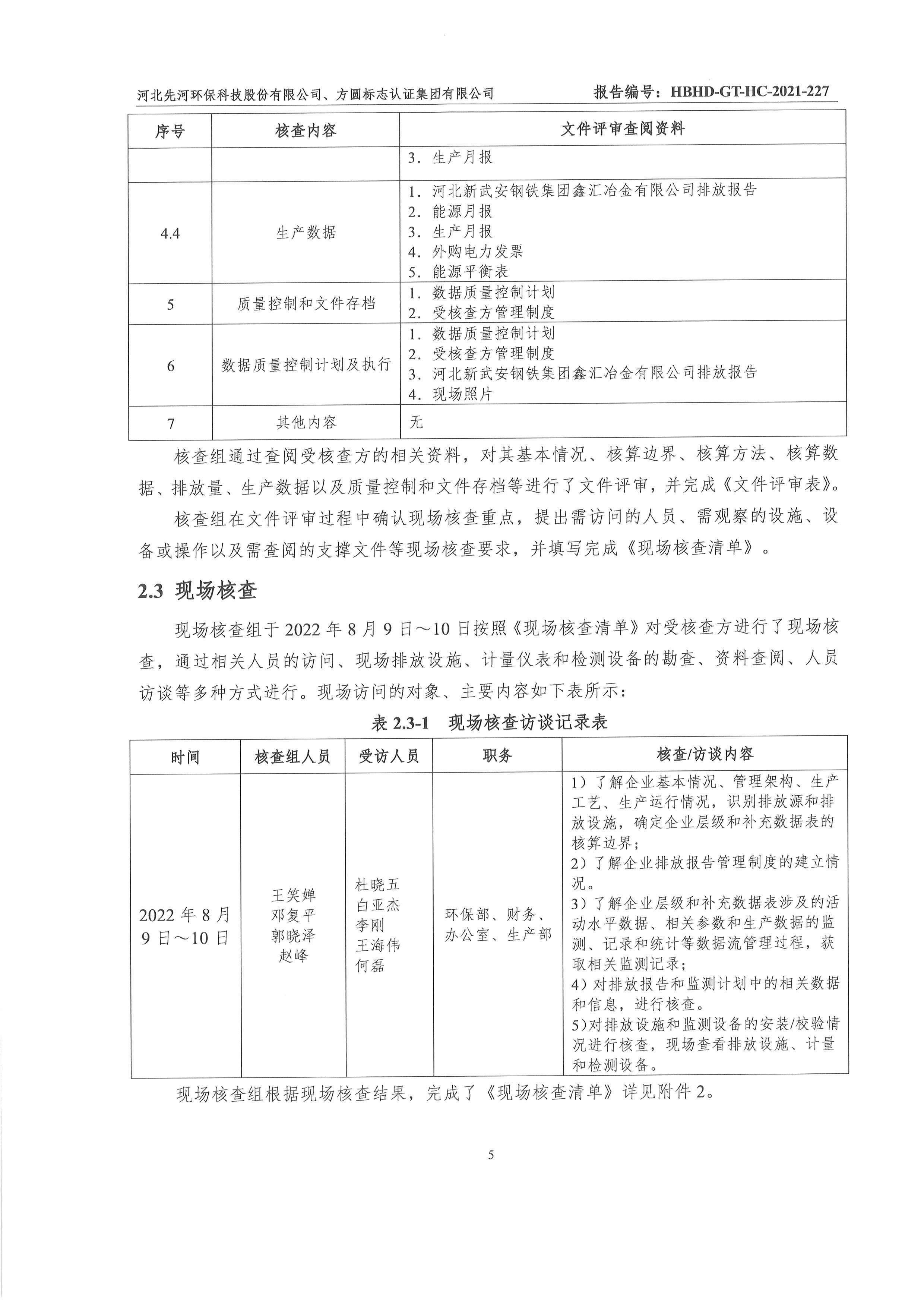 2022年河北新武安鋼鐵集團鑫匯冶金有限公司碳排放核查報告